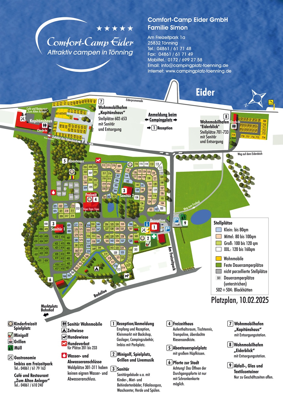 Auf einer Fläche von 7 Hektar bieten wir Ihnen große Stellplätze mit Strom-, Wasser- und Abwasseranschlüssen. Die Wohnmobilhäfen „Eiderblick“ und „Kapitänshaus“ befinden sich an der Eider.